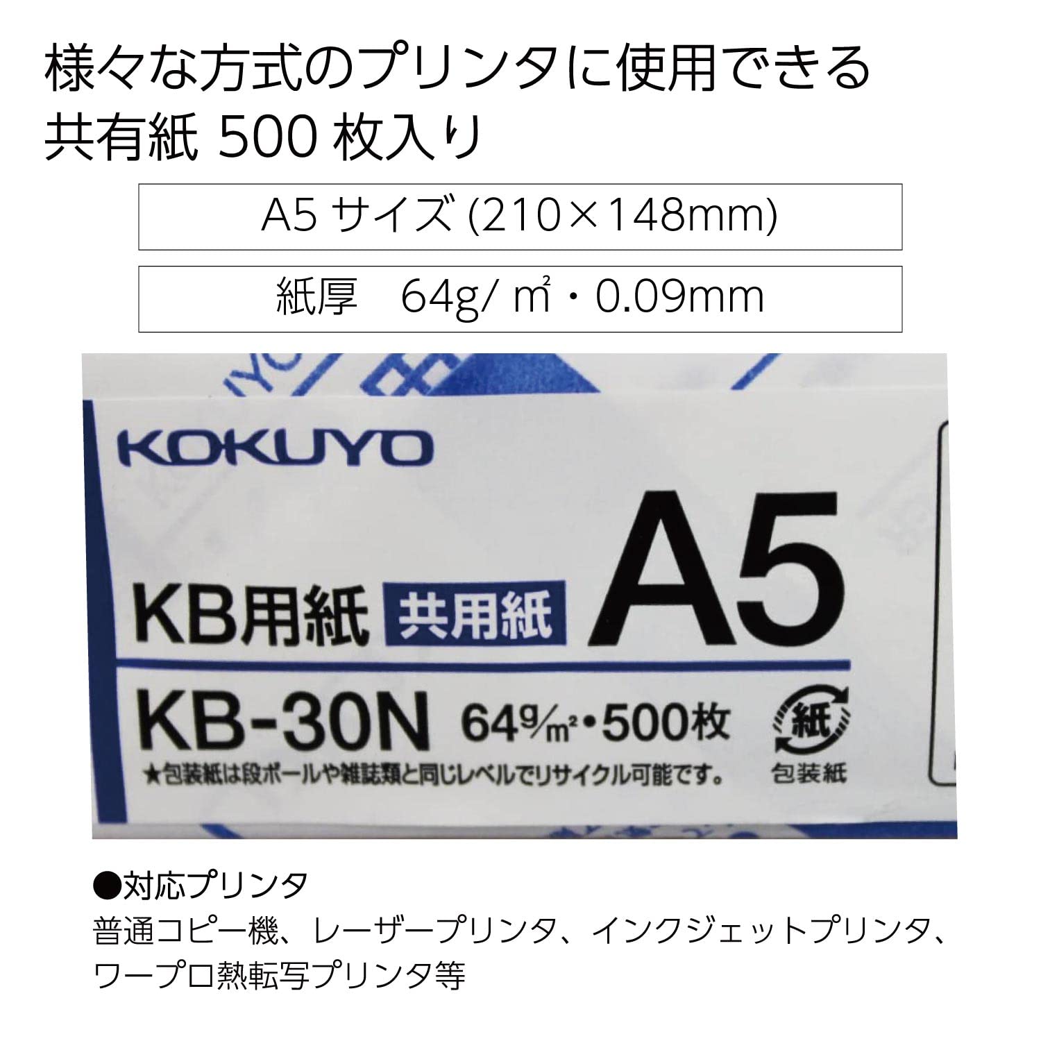 Kokuyo A5 KB Paper, 500 Sheets, 64gsm, 80 Bright (ISO) - Perfect for Printing, Custom Planner and Journal - 5-7/8 x 8-1/4 in, FSC Certified, Japan Import (KB-30N)