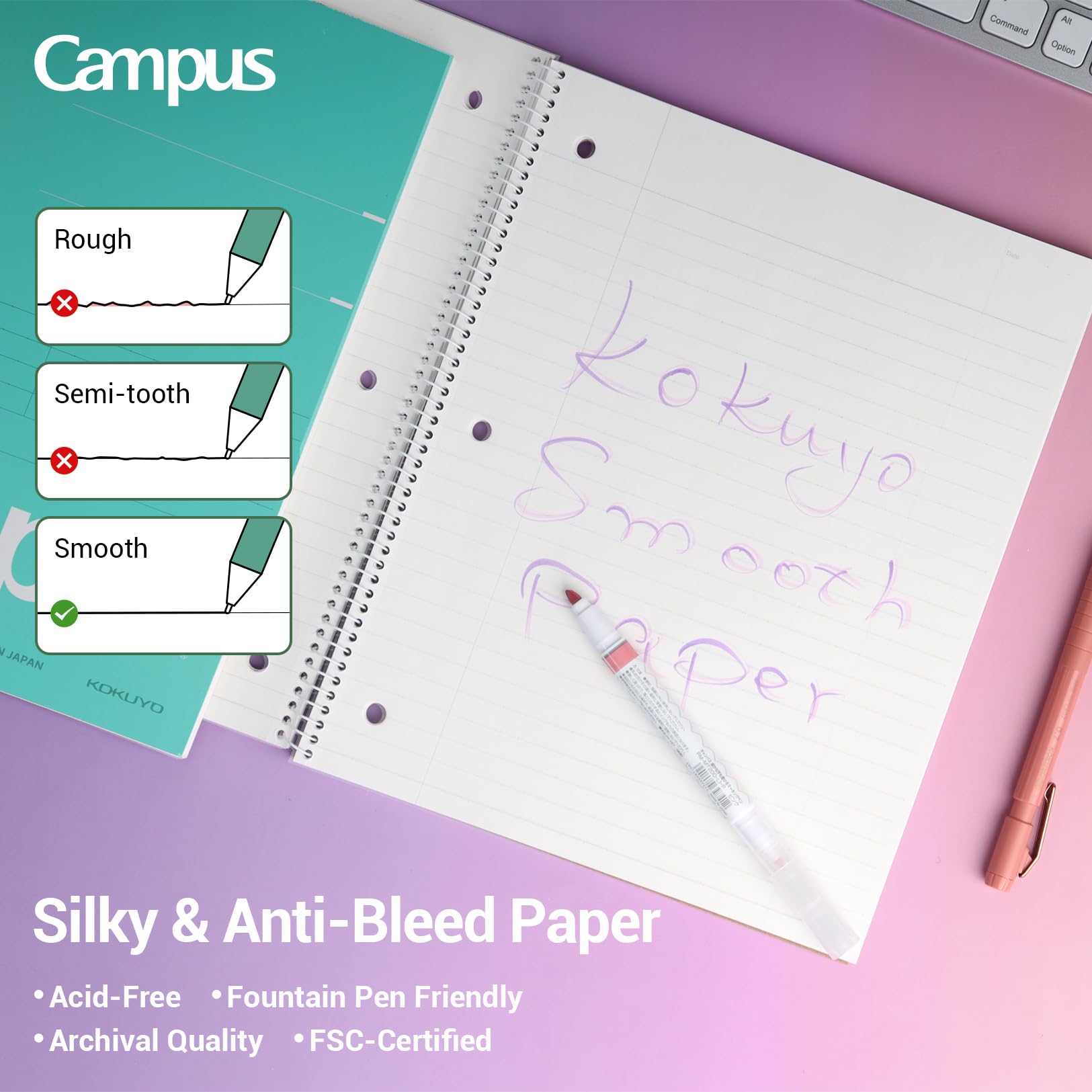 - Silky Smooth Writing. Japan imported original Campus papers, developed through extensive research for the most comfortable writing experience with any writing instrument. The paper is ink-fight and feathering for most writing instruments (such as ballpoint pens, gel pens, ballpoint pens, etc.) and ensures a smooth writing experience whether at school or at work.