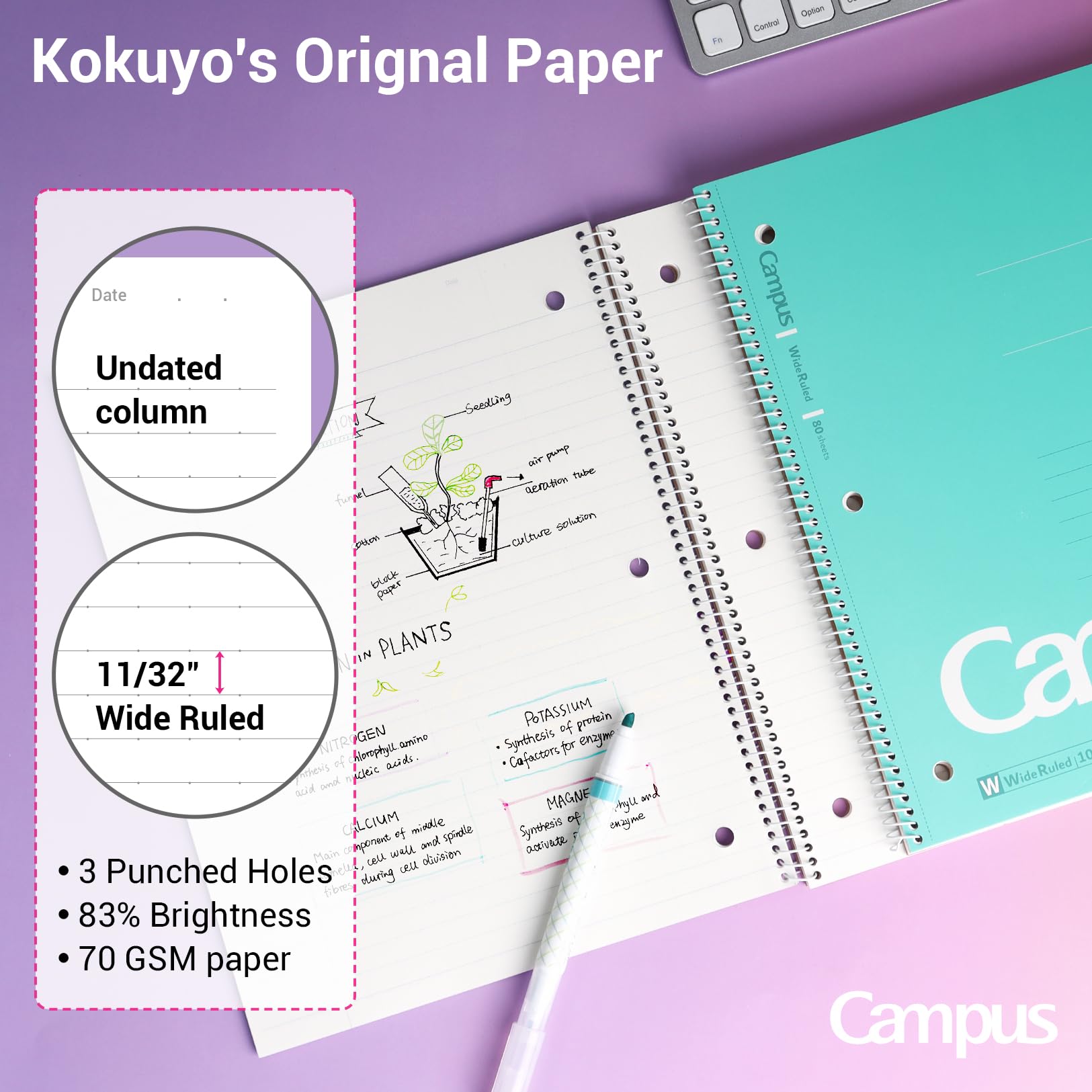 KOKUYO Spiral Notebook, 3 Pack Campus 10-1/2" x 8" Subject Notebooks with Wide Ruled, 80 Sheets, Purple Orange Turquoise 3 Holes School Spiral Journal for Work Study Note Taking (WSG-SU-400G3×3)