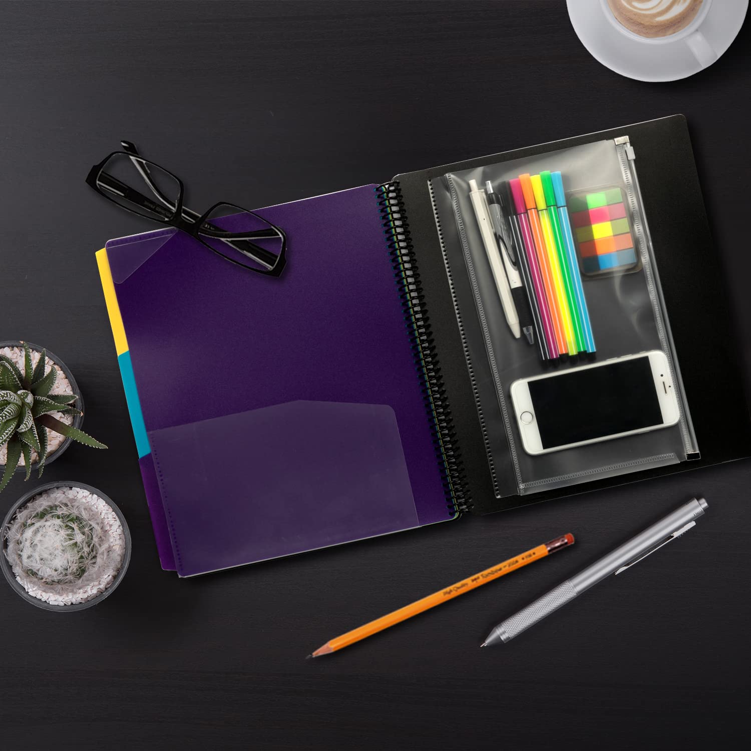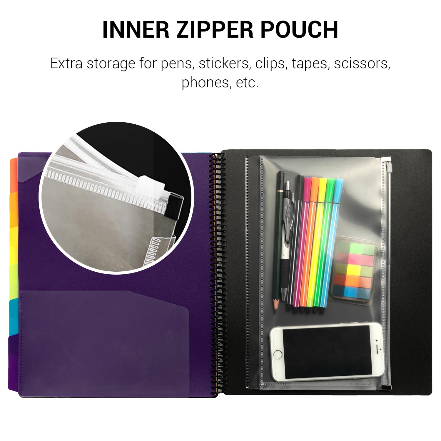 - Personalizable Cover: A durable clear front cover for personalized title page. Extra Zipper Pouch: Built-in clear inner zipper pouch for storing writing utensils, sticky notes, stickers and more.