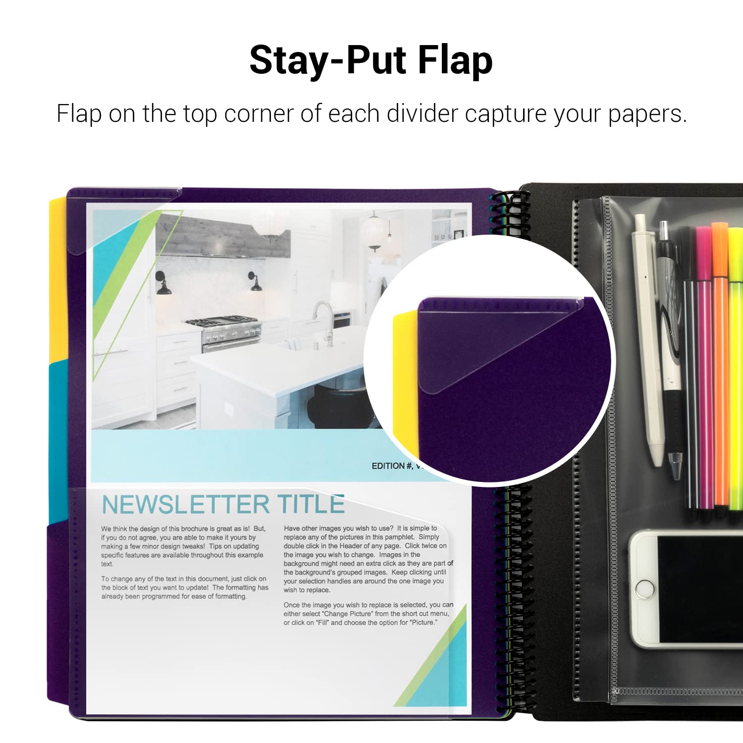 - Stay-Put Flap: Flap on the top corner of each divider capture your papers and increased durability and helps this poly organizer lay flat.