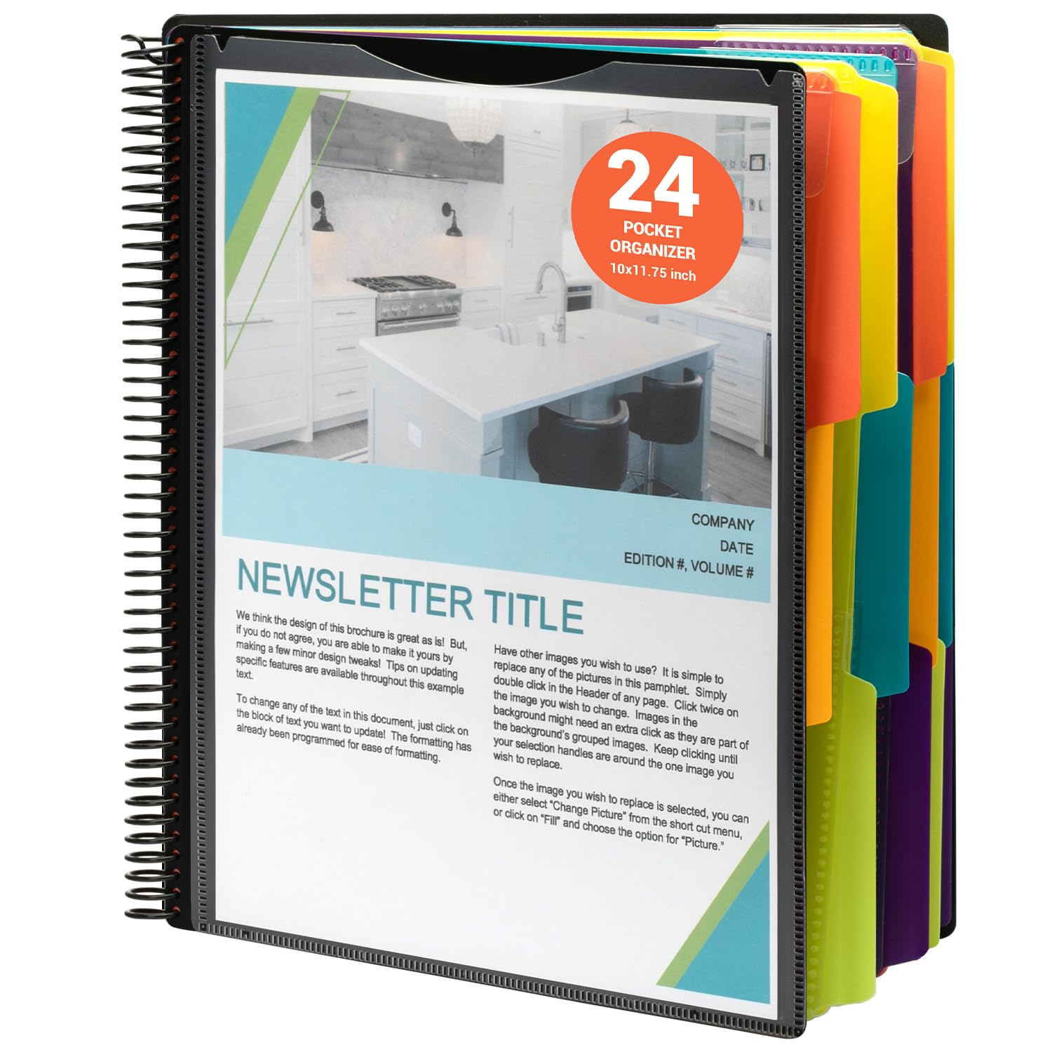mukawa 24 Pocket Poly Project Organizer, Binder Organizer Spiral Project Folder Multi Pocket Folder Binder with Pockets Letter Size, Back Cover Utility Pouch, 1/3 Cut Tabs, 12 Tab Color Dividers, Clear View Customizable Front Cover for School Office Filing Cabinet Get organized and stay focused on your projects using this 24 pocket poly project organizer. Perfect for multiple projects or just one. Great for when you are on the go and need all your materials contained in one place. Features a clear zippered pouch on the inside back cover for storing small incidentals. Durable poly material is tear and water resistant.
