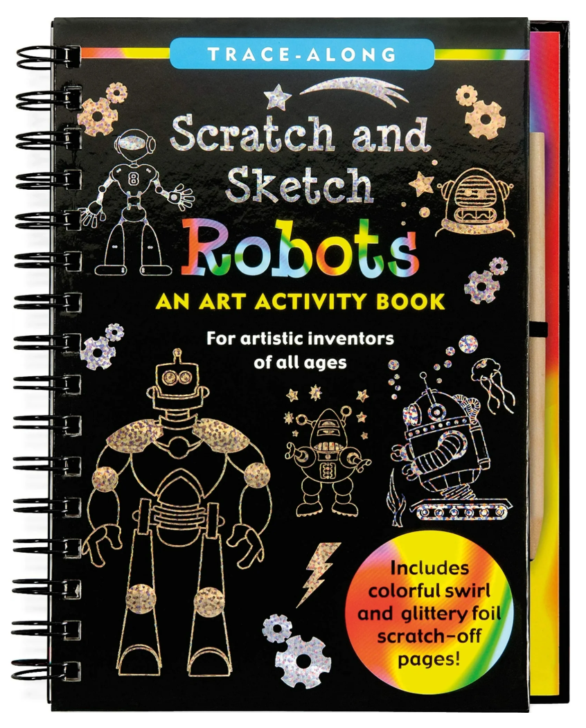 Unleash your creativity with Scratch & Sketch Robots! This interactive art activity book is designed for young artists (ages 5 and up) who love technology and robots. Trace along the white outlines with the included wooden stylus to reveal robots in vibrant colors and shiny foil. Whether they’re DJing, time traveling, or exploring the sea floor, these robots come to life with every scratch!