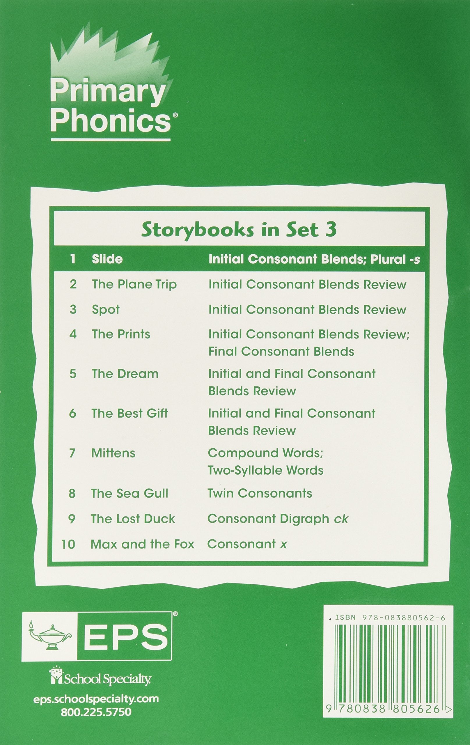 Primary Phonics is a systematic, phonics-based early reading program. This series builds essential literacy skills including phonemic awareness, phonics, fluency, and comprehension. Primary Phonics is comprised of 5 sets of storybooks, coordinating workbooks, reference books, teacher s manuals, and an audio story CD for students in grades K-2. The extension More Primary Phonics allows for additional practice with two more sets of storybooks and workbook exercises.Primary Phonics also includes a comprehension component called Thinking about Mac and Tab. The comprehension workbooks follow the same phonetic patterns as the coordinating workbooks and storybooks. The 147 wh- 148 question words (who, what, why, etc.) are introduced as sight words, as students independently work through the series. Students learn to sequence, recognize story elements, use context clues, and refer to storybook pages, among other skills. Each workbook corresponds to a set of Primary Phonics storybooks 1-5.Storybooks Set 3 reinforces and provides practice with the skills taught in Workbook 3. Publisher: Educators Publishing Service Author: Barbara W. Makar Grades: K-2 Format: 10 paperback storybooks ISBN: 9-780838-885628